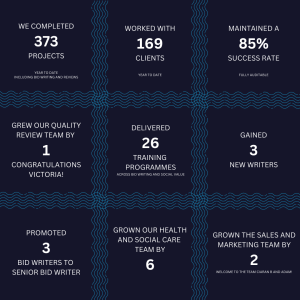 Lastly, our spring recruitment drive resulted in the appointment of three new bid writers, all of whom are progressing well and transitioning smoothly into the bid and tender writing industry. Learn more about Jemma, Ewan and Grace on our meet the team page.